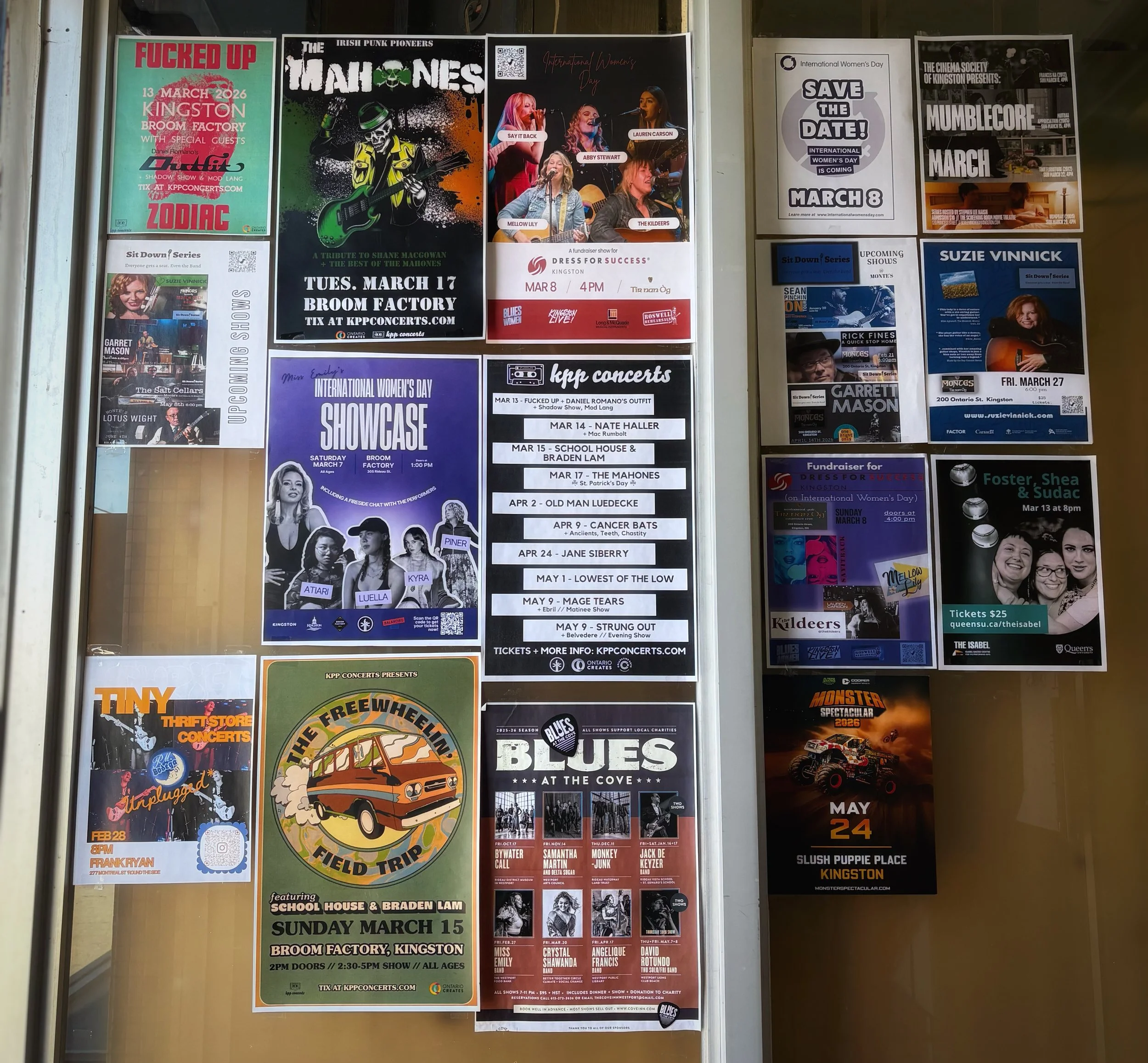 Behold: the Poster Wall. The original social network, but with more paper cuts and fewer things your aunt shared by accident. A friendly reminder that there are always good shows, kind strangers, and loud songs waiting nearby. Check it often… plans may occur.